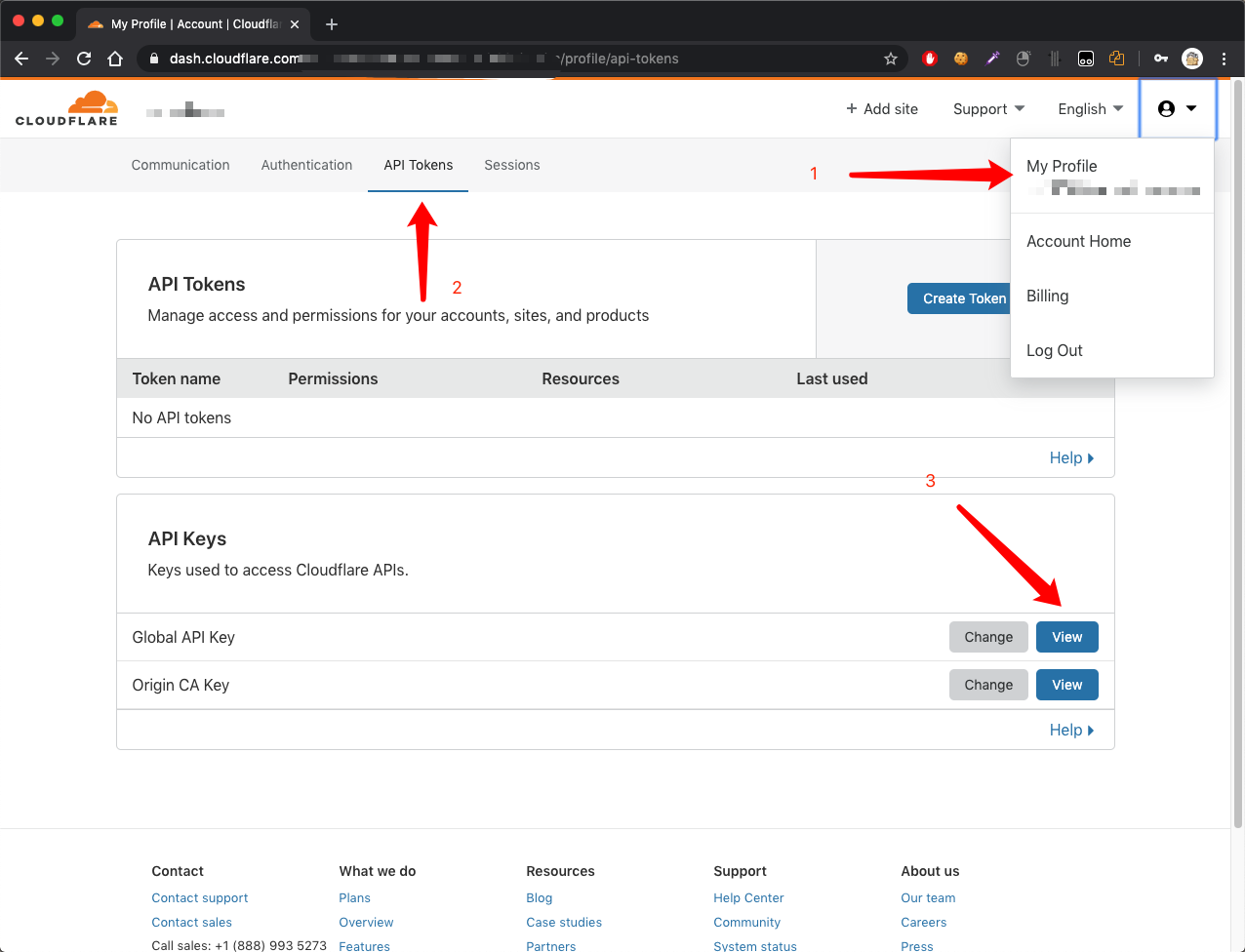 这里我采用 dns mode 申请证书,以解决 standalone mode 需要 socat 占用 80 端口的困扰。我的域名解析托管在 Cloudflare ,其他解析商请参考 acme.sh 项目的 READEME.md。使用 dns mode 首先需要获取 Cloudflare 账户的 API Key,具体方法如下图